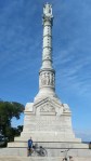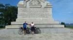 I came to a tunnel and a sign said “no bicycles allowed.” I thought that it wasn’t long enough that I couldn’t ride though it safely. But my GPS took me off the Colonial Parkway and into Colonial Williamsburg. I rode on the Colonial Williamsburg dirt streets and felt like a real party-pooper riding my Cannondale through all the tourists. Before long I was back on the Colonial Parkway. 25 miles goes by pretty fast when you are only going that far and soon I was at the exit for the Yorktown Battlefield. As I was paying attention to the signs, I hit a crack in the pavement that hit the front wheel hard and caused a snake bite puncture of my tire. I am literally within sight of the visitor center where I will meet Kathie. I decide to ride on, flat tire or not. I rode my bike to the truck and put the front wheel back on Kathie’s bike. Her brakes did not like the ride across country and would not release. Again, I’m too close to mess with small details, I unhook the front brakes on her bike. We ride through town to the waterfront and Kathie takes a picture of me rolling my bike into the Chesapeake Bay and Atlantic Ocean. We had lunch on the waterfront and took pictures at the Revolutionary War Victory Monument. I have completed a goal that started years ago. I couldn’t believe I have ridden my bike from coast to coast. I couldn’t have done it without the miracles of a Loving God. It is a goal that Kathie has shared with me and been such a support. It wouldn’t have meant as much to me if I hadn’t had her to share with me. Thank-you Kathie.